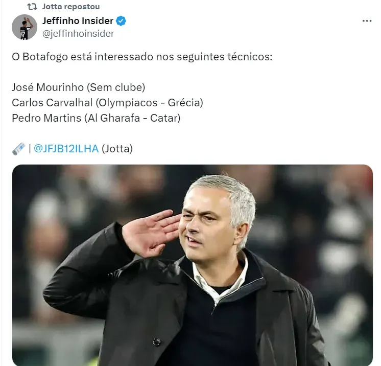 O nome de Mourinho ganha força para assumir o Botafogo em meio a demissão de Tiago Nunes, que foi demitido do Glorioso após empate pela Libertadores.