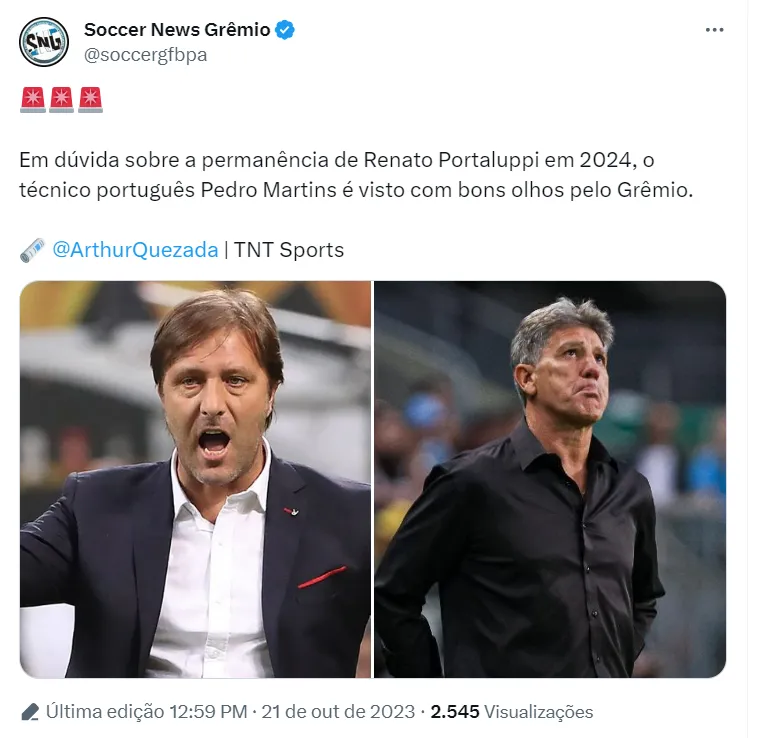 Segundo informações de Arthur Quesada, da TNT Sports, com a incerteza sobre a permanência de Renato Gaúcho para 2024, a diretoria do Grêmio vê Pedro Martins com bons olhos como uma possível opção. A fonte não forneceu detalhes adicionais.