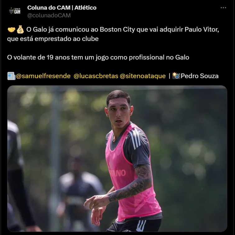 O atleta está emprestado ao Galo pelo Boston City Brasil até o fim de 2024. O jovem sendo relacionado para as partidas do time principal. Com um grande potencial, a diretoria vai exercer a opção de compra.