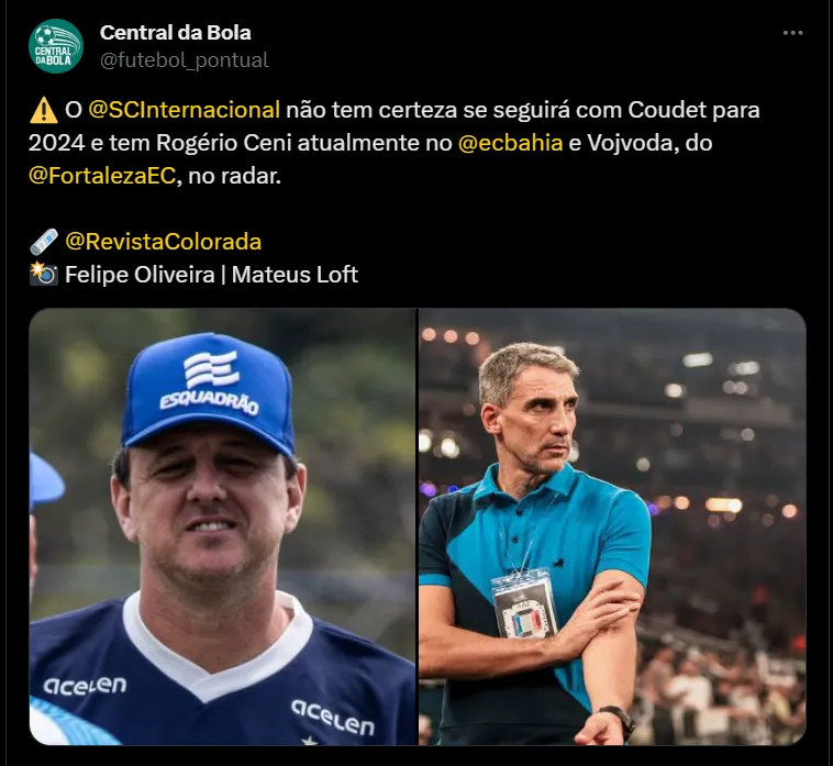 De acordo com as informações publicadas pelo portal “Revista Colorada”, o Internacional avalia se seguirá com Eduardo Coudet para 2024 e tem Rogério Ceni na mira.