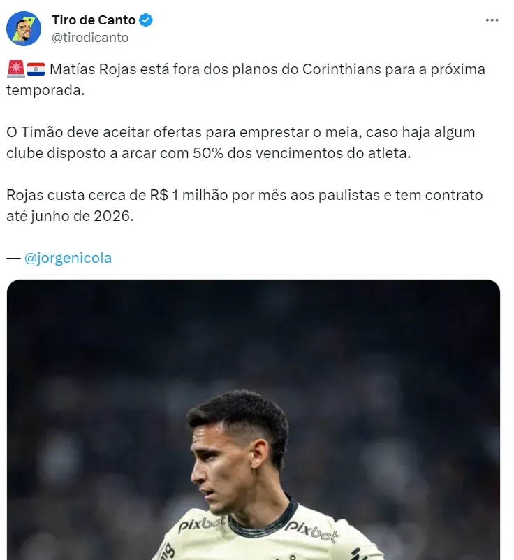 Com um salário de R$ 1 milhão por mês, Rojas, no entanto, ainda não conseguiu render o esperado, seis meses após fechar com o clube e encontra-se na lista de saídas, segundo aponta Jorge Nicola, que informa que o meia não faz parte dos planos de Mano Menezes para 2024.