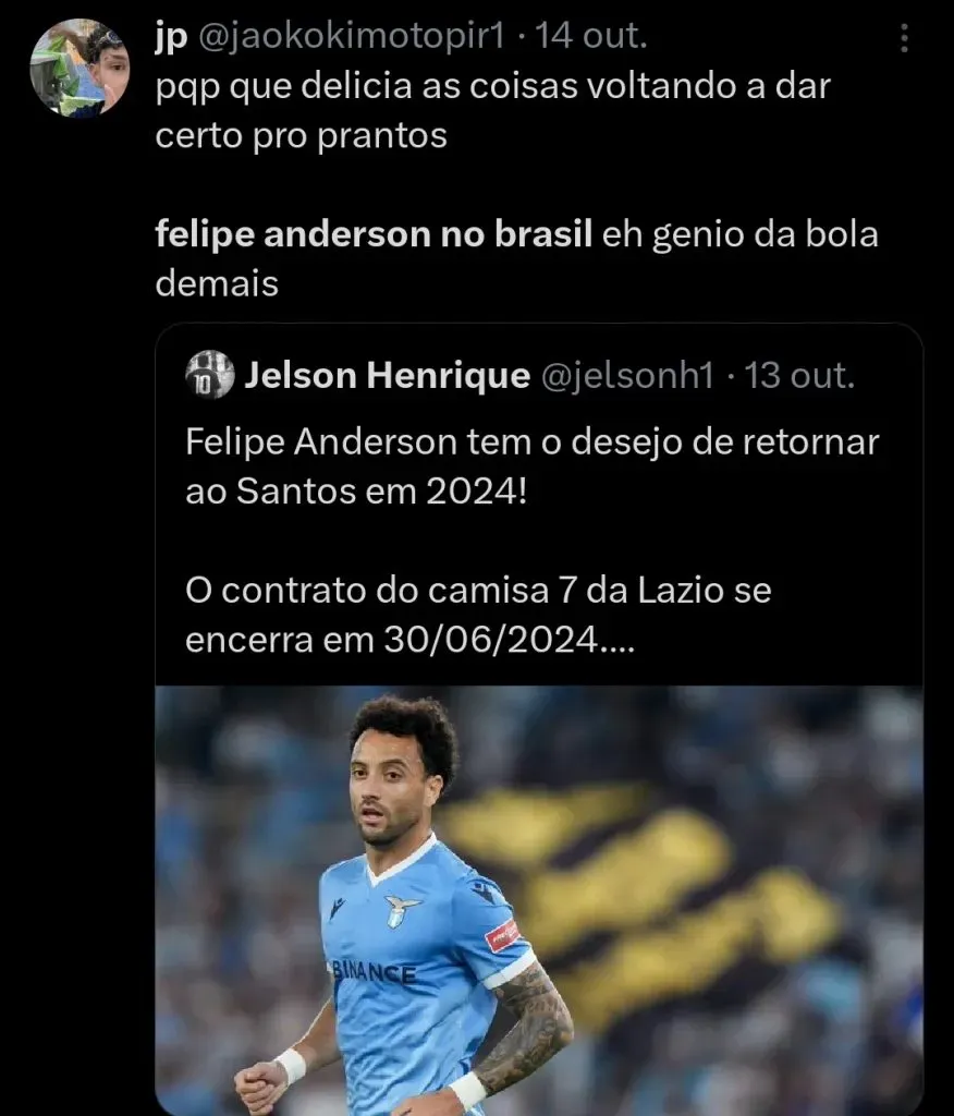 O atacante Felipe Anderson com passagem pelo West Ham e que hoje está na Lazio, pode estar retornando para o futebol brasileiro nos próximos meses.