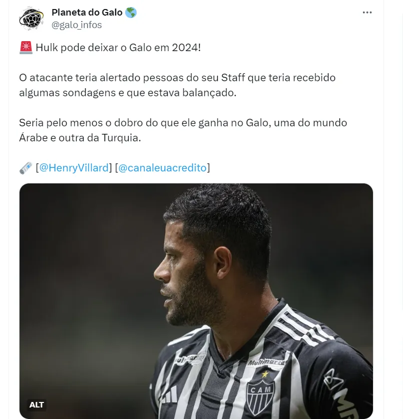 Diante da forte declaração de Hulk, foi informado que o atacante poderia deixar o futebol brasileiro em 2024. A informação veio do ‘canal Eu Acredito’. De acordo com a fonte, a sondagem envolveria um salário duas vezes maior do que ele recebe no Galo.