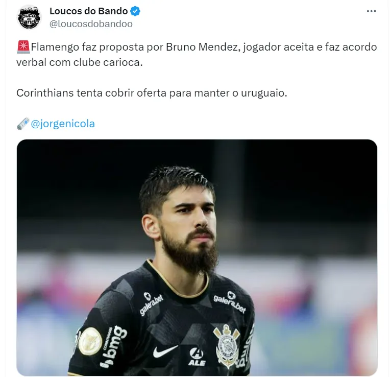 De acordo com a fonte, Bruno Mendez tem um acordo verbal para jogar no Mengão em 2024, a custo zero, uma vez que seu contrato com o Corinthians vai até dezembro. Ciente de que pode perder seu grande zagueiro, o Timão tenta renovar com o atleta, mas está ciente de que isso é uma tarefa difícil. Há outras fontes informando que o salário do zagueiro no Rio de Janeiro tende a ser de R$ 800 mil.