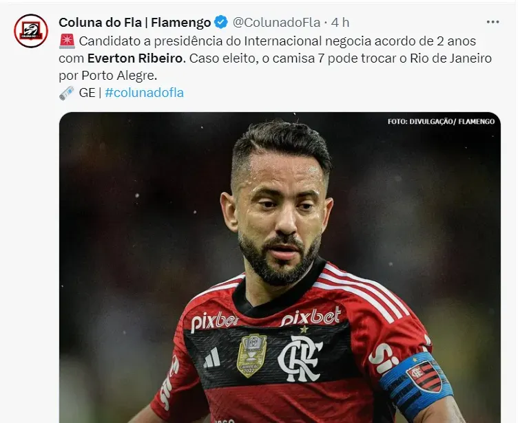 Em fim de contrato com o Flamengo, Everton Ribeiro tem conversas avançadas para jogar com as cores do Internacional em 2024, caso Roberto Melo vença as eleições do clube Colorado.