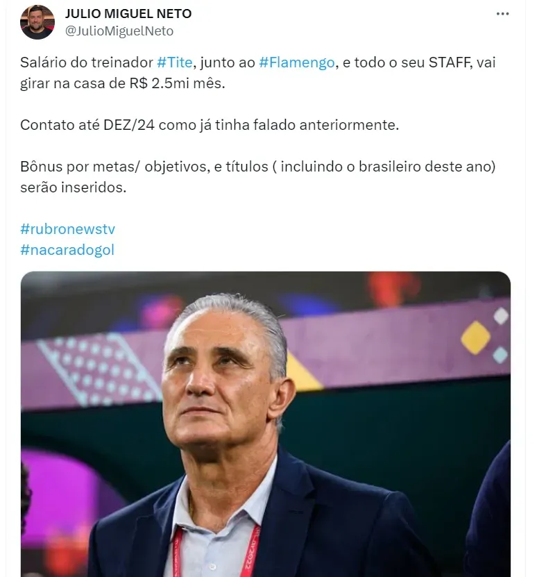 O contrato de Tite com o Flamengo será válido até dezembro de 2024, coincidindo com o fim do mandato de Landim, e seu salário mensal será de R$ 2,5 milhões, juntamente com sua comissão técnica, de acordo com informações de Julio Miguel Neto.