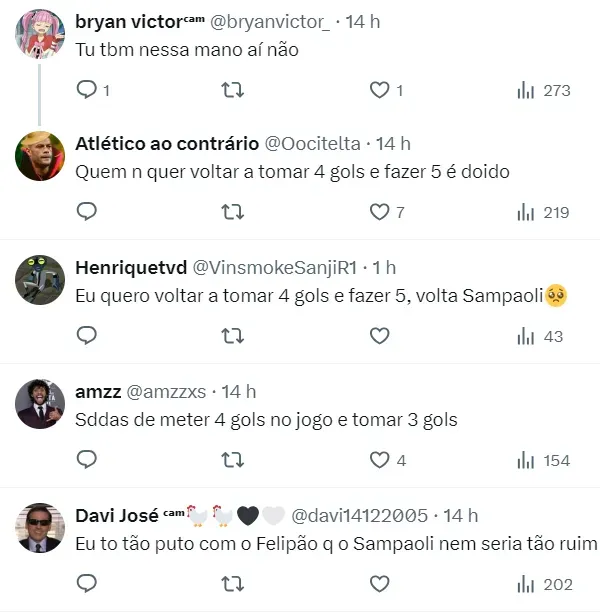 Nas redes sociais, parte da torcida do Atlético-MG é a favor da volta de Sampaoli ao clube de Belo Horizonte. O Atlético não vive grande momento neste começo de temporada sob o comando de Felipão.