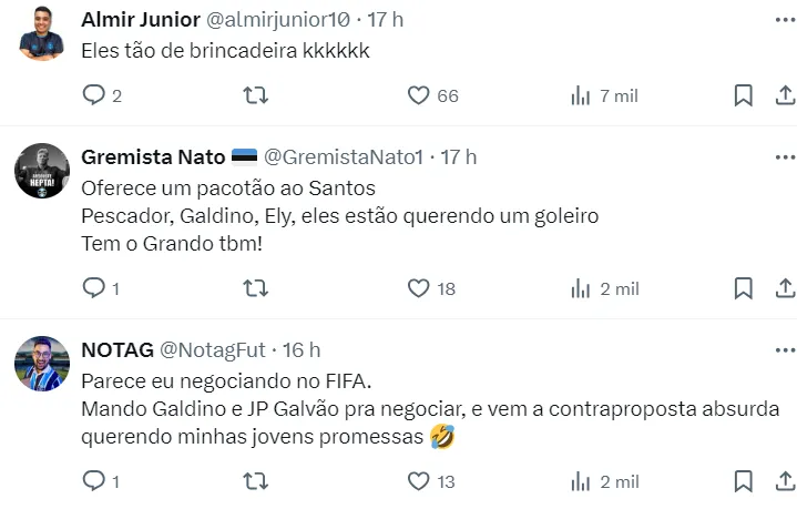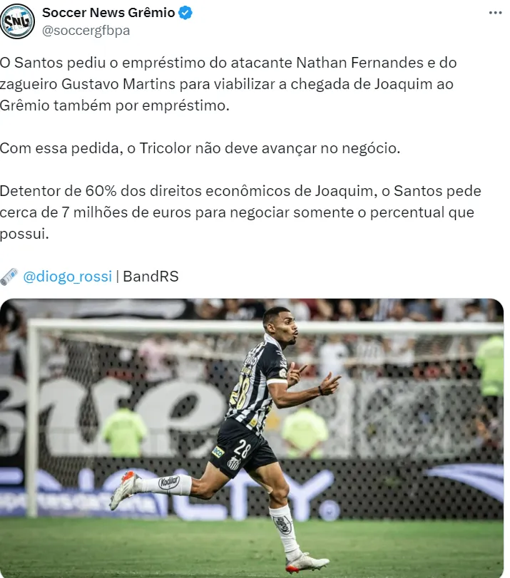 Por esse molde, não há negócio. O Grêmio, de fato, está bastante interessante em Joaquim, mas entende que a pedida do Santos é considerada alta e, por isso, não vai avançar.