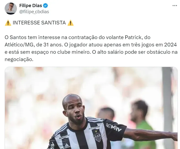 Além de Pedrinho, Patrick é alvo do Santos. O jogador está sem espaço no Galo e realizou apenas três jogos na temporada. O Peixe tem interesse, mas pode brecar no salário, segundo informa Felipe Dias.