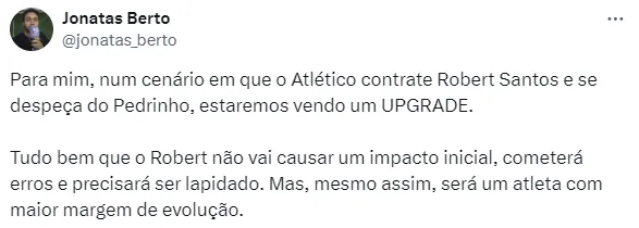 Mas, enquanto isso, Pedrinho segue em Belo Horizonte. Na carreira, além de Atlético, Shakhtar e Corinthians, o jogador de 25 anos soma passagem pelo Benfica, de Portugal.