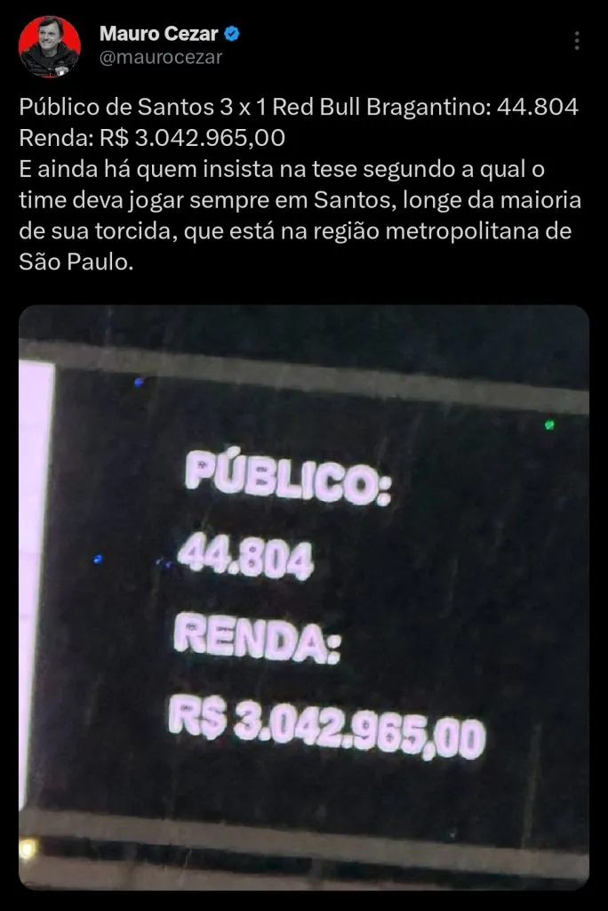 Público e renda da partida entre Santos x RB Bragantino: Foto/Reprodução: Redes Sociais