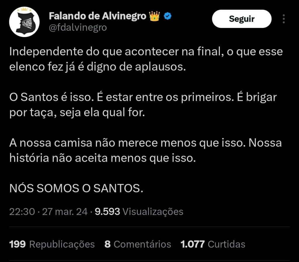 Além do recorde histórico, o Peixão também atinge um feito importante para a sequência da temporada. O clube está retornando a uma final de Paulistão após longos 8 anos sem conseguir tal conquista.