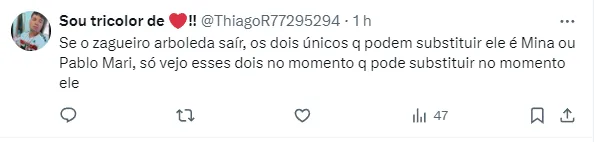Na atual temporada, o jogador de 32 anos soma 10 jogos disputados. Em 2023, quando foi um dos destaques na campanha do título da Copa do Brasil, Arboleda somou 42 partidas em campo.