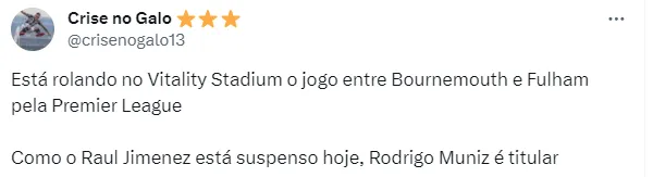 Na atual temporada, o brasileiro soma 11 jogos disputados, com um único gol marcado. Hoje, inclusive, Muniz foi titular na partida do Fulham diante do Bournemouth.