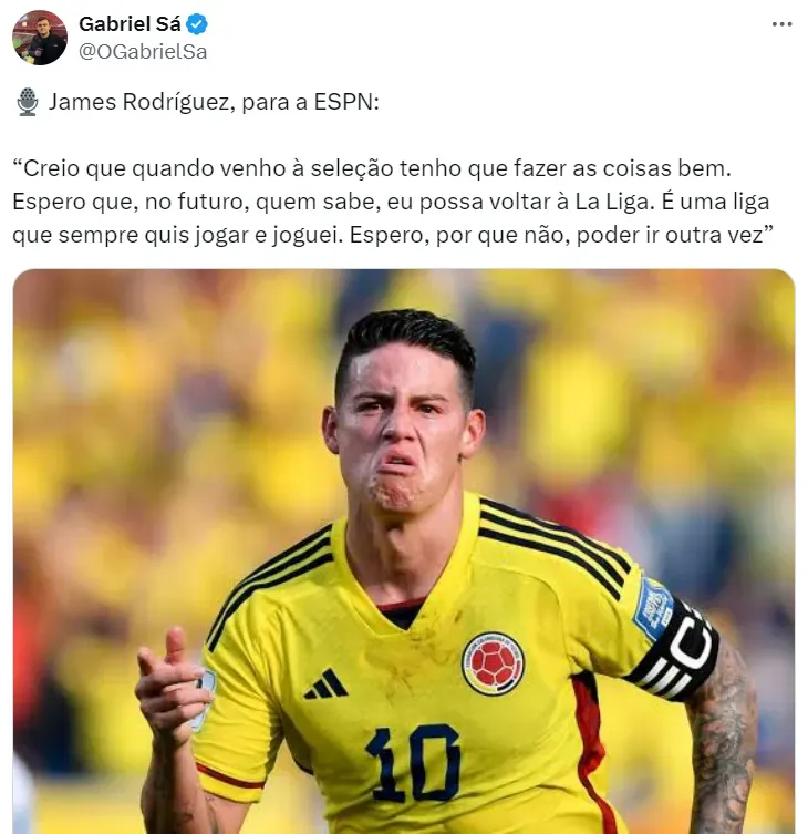 Após o jogo, James concedeu entrevista e revelou que deseja voltar à Espanha, país onde ele viveu seu melhor momento com as cores do Real Madrid. O jogador não coloca nenhuma data específica, mas dois clubes estão de olho no atleta.