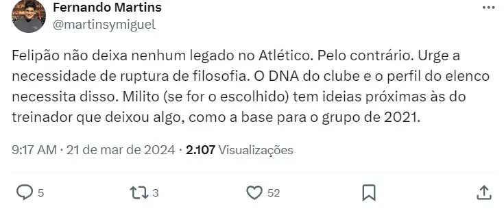 “Esquece. Felipão não tem o estilo de jogo que a gente pensa para o São Paulo. A gente deseja o time positivo, com posse de bola e ofensivo”, informou a fonte sobre o treinador.