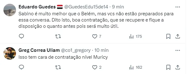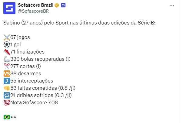 Sabino está com 27 anos de idade e, na carreira, além do Sport, soma passagens por clubes como Santos e Coritiba. Em 2023, disputou 58 jogos pelo Rubro-Negro, com sete gols marcados.