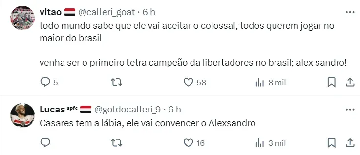 No Brasil, o São Paulo está ciente da situação do lateral em Turim e tem interesse no jogador. O Tricolor foca em Alex Sandro em meio à saída de Caio Paulista para o Palmeiras e a possível saída de Welington para o Inter.