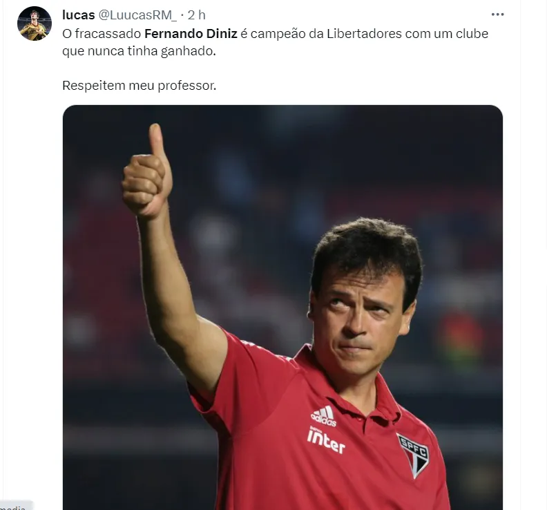 Diniz manda recado para as críticas: “Tem que continuar falando. Tem que ter peso. Tem que ter culhão para falar. Porque se tivesse perdido, eu ia chegar aqui e bancar e falar assim ‘era o que acreditava’. Então fala o que acreditava, não fica mudando a versão porque ganhou. Que tipo de pessoa é essa”, desabafou Fernando Diniz.