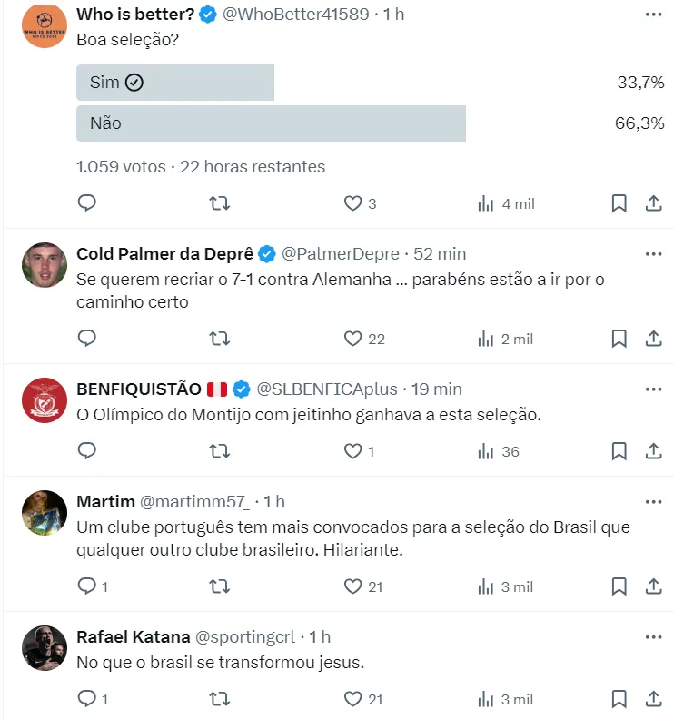“Vivi para ver o dia em que a Seleção de Portugal é melhor que a Seleção Brasileira em quase todas as posições”, aponta outro torcedor português.