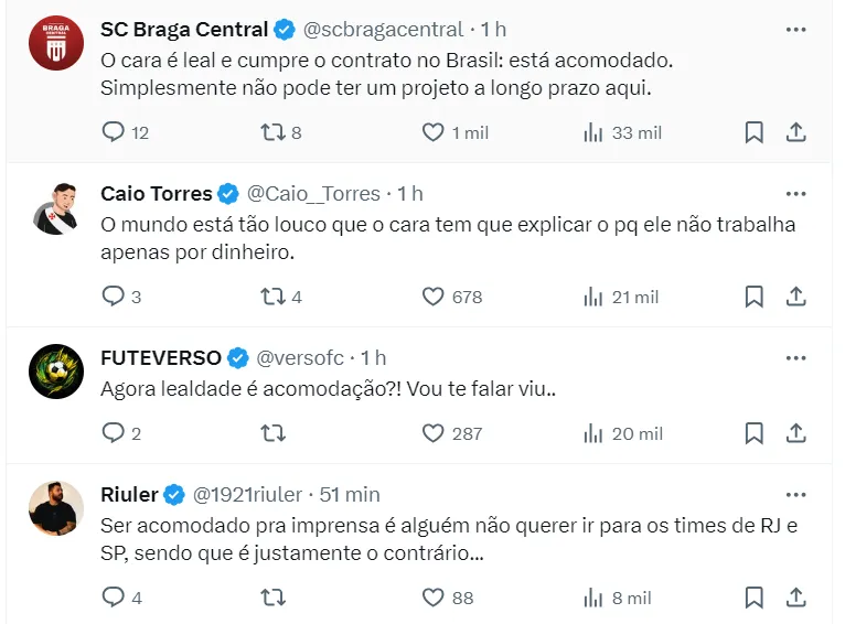 “Fortaleza tem pressão também, recebo muitas críticas quando perdemos. Estou morando em uma cidade que gosto. Por que vou para outra cidade? Por dinheiro? Pode ser, mas eu tenho direito de decidir onde quero morar, onde quero trabalhar e com quem quero trabalhar”, disse ele.