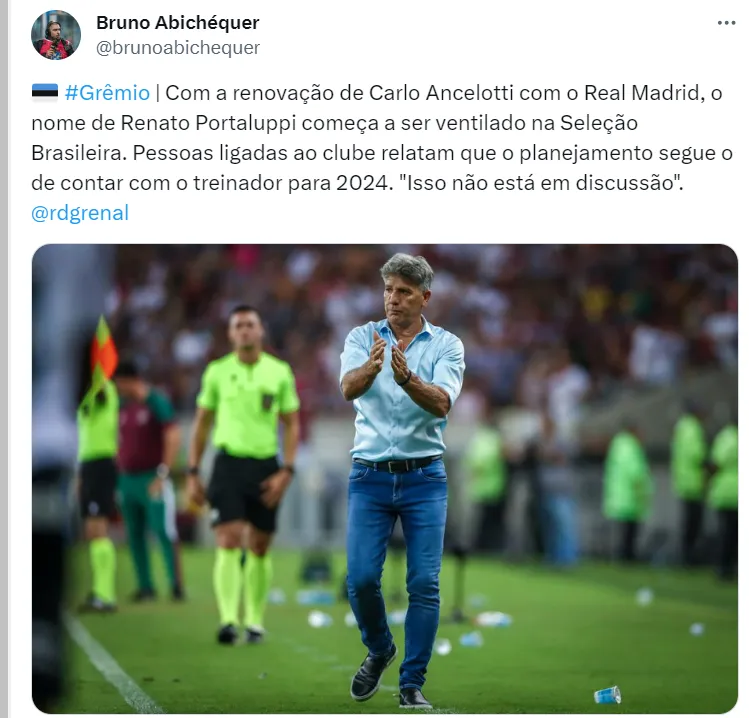De acordo com Bruno Abichéquer, o nome de Renato Gaúcho começa a ganhar força nos bastidores da Seleção Brasileira. A fonte não entra em maiores detalhes, já que não tem conversas em andamento, mas informa que o nome de Renato é pauta para a CBF.