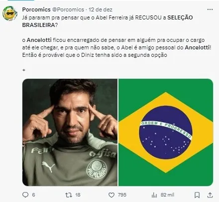 “Já falei que o meu treinador seria o Jesus ou o Abel. Chegou a hora de o futebol brasileiro entender que não temos treinador em condição para fazer a seleção jogar a outro nível”, afirmou o comunicador.