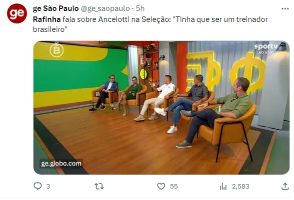 “Apesar de ele ser um treinador muito vitorioso, meu amigo, tentou me levar para o Napoli, mas eu estava no Bayern. Tenho o maior carinho, mas torço para que seja um brasileiro.”