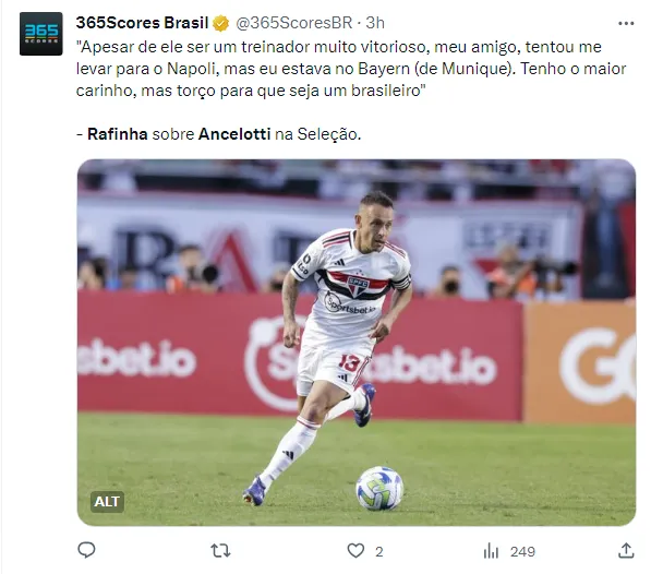 Na opinião do experiente jogador, o treinador da seleção deve ser um brasileiro, já que é tradição no país do futebol. Rafinha ainda afirmou ser muito amigo de Ancelotti, no entanto, ele prefere outro nome no comando do Brasil.