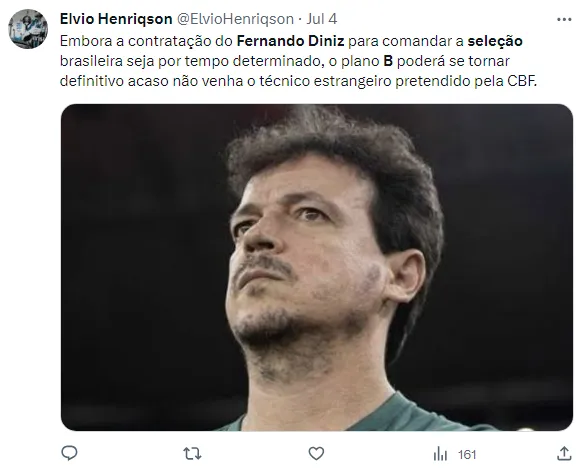 “Não tem que vir europeu aqui, não. Treinador da Seleção Brasileira tem que ser brasileiro. Fernando Diniz vai dar conta do recado”, disse ele, em entrevista a Priscila Senhorães.