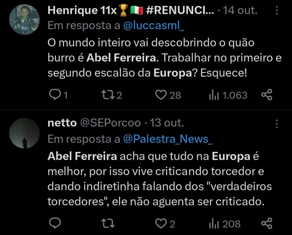 Além disso, segundo a ESPN, o Palmeiras sequer procurou Abel para renovar seu vínculo, que se encerrará no fim do próximo ano.
