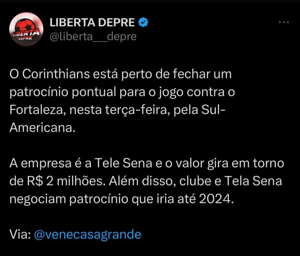 Segundo informações do jornalista Venê Casagrande, o Corinthians está próximo de fechar novo acordo milionário para ter patrocínio pontual na partida contra o Fortaleza, na terça-feira, válida pelas semifinais da Copa Sulamericana.