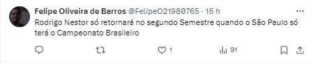 A última partida de Rodrigo Nestor foi na vitória do São Paulo em cima do Cruzeiro por 1 a 0, pela 31ª rodada do Campeonato Brasileiro do ano passado, no Morumbi.