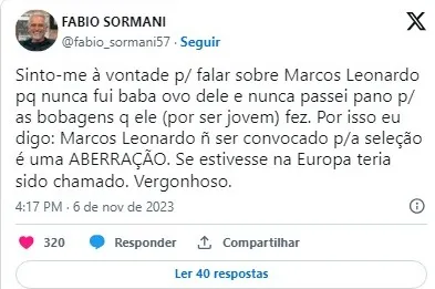 Sormani expressou seu desagrado nas redes sociais, afirmando que Marcos Leonardo, do Santos, merecia uma vaga na seleção e que a omissão de seu nome na lista é uma “aberração.” Ele destacou que se Marcos Leonardo estivesse atuando na Europa, sua convocação teria sido uma realidade, e considerou a situação vergonhosa.