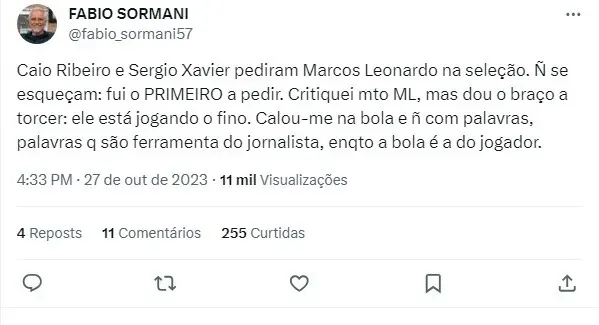 “Caio Ribeiro e Sergio Xavier (comentaristas do SporTV) pediram Marcos Leonardo na seleção. Não se esqueçam: fui o PRIMEIRO a pedir. Critiquei muito ML, mas dou o braço a torcer: ele está jogando o fino. Calou-me na bola e não com palavras, palavras que são ferramenta do jornalista, enquanto a bola é a do jogador”, declarou Sormani.