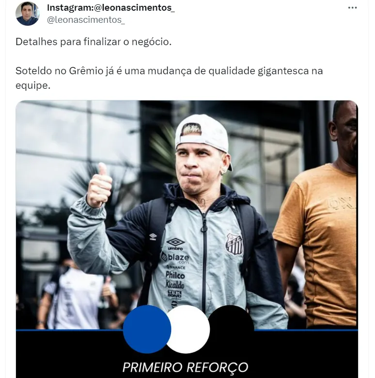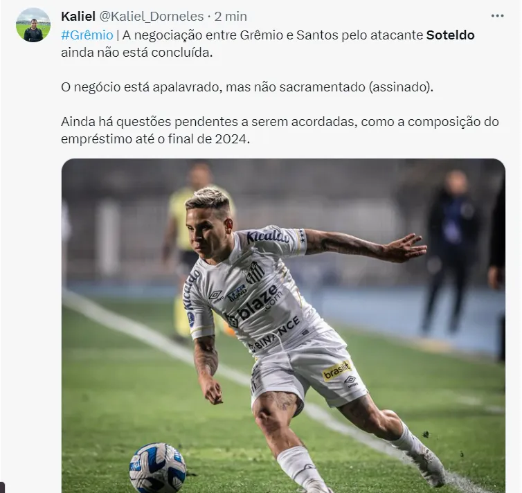 Com Grêmio e Santos em conversas avançadas, Soteldo chegou a um acordo verbal para defender as cores do Tricolor em 2024, avança o jornalista Leo Nascimento.