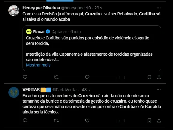 “Além disso, as torcidas Império Alviverde e Mancha Alviverde, do Coritiba, Máfia Azul e Pavilhão Independente, do Cruzeiro, foram afastadas de jogos dos clubes. Outra decisão foi a interdição imediata da Vila Capanema”, detalha a ESPN.