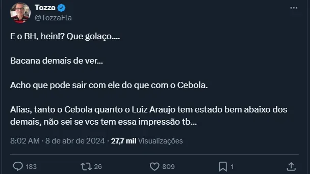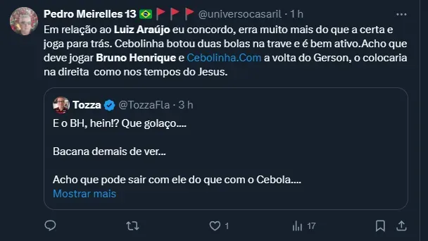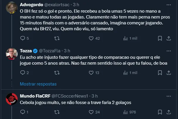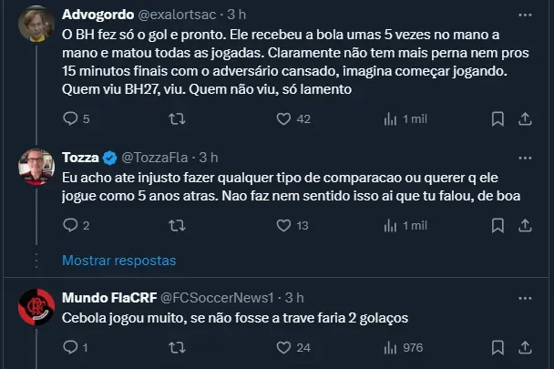 Torcedores do Rubro-Negro sugerem que BH27 tem que ser titular com o técnico Tite e apontam que continuar o testando no lugar de L. Araújo é a melhor alternativa.