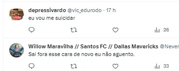 “Ir para a Série B para passar sufoco retrancado vai ser triste” , “Não, pelo amor de Deus!!” , “Prefiro ir atrás do treinador do Goiás” , “Sai fora, é cada ideia” , “Eu vou me suicidar” , “Sai fora, esse cara de novo eu não aguento”, “Foram 3 anos f*, sofrendo com essa m* de jogo reativo/retranca que o Rueda nos impôs e agora já começar com Carille sendo cogitado (se de fato estiver) é desanimador de um jeito“.
