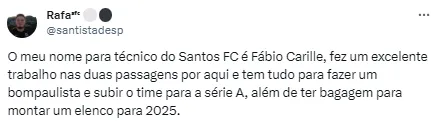 E a torcida se manifestou na web sobre uma possível chegada de Carille para comandar o Santos em 2024. Muitos gostaram do nome dizendo ser a melhor alternativa no momento.
