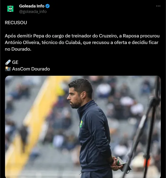 De acordo com as informações publicadas pelo GE, o Cruzeiro tentou a contratação do técnico António Oliveira, que está no Cuiabá.