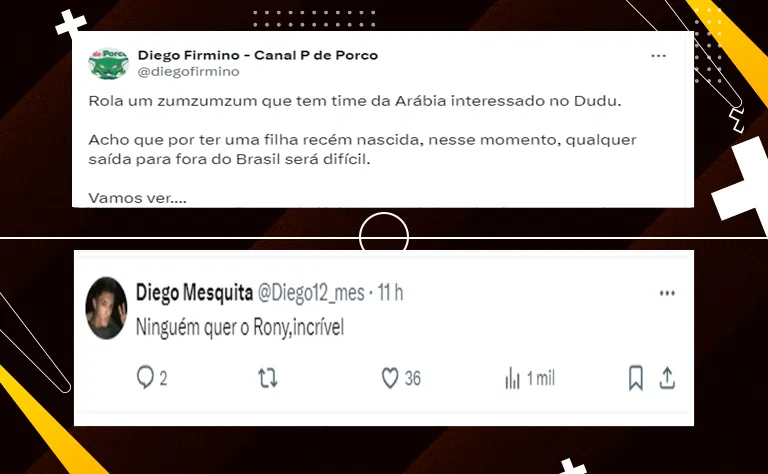 Isso porque, conforme repercutido por Diego Firmino, há rumores de que Dudu estaria na mira de um clube da Arábia Saudita. Entretanto, neste momento, uma transferência para o exterior não parece ser prioridade.