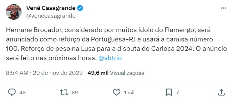 Venê Casagrande conta que Hernane será anunciado em breve como novo reforço da Portuguesa-RJ e usará a camisa de número 100. O anúncio será feito nas próximas horas.