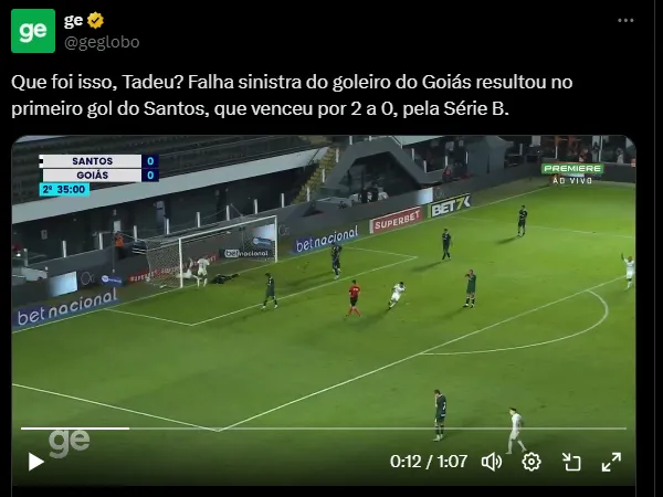 O Goiás visitou o Santos na Vila Belmiro e perdeu pelo placar de 2 a 0. Tadeu (gol contra) e Willian Bigode foram os responsáveis pela vitória do Peixe na 11ª rodada do Brasileirão Série B.