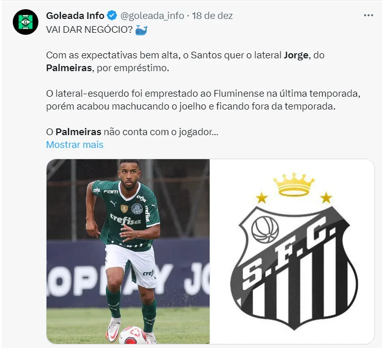 Jorge, do Palmeiras, bastente conhecido da torcida do time da Baixada Santista, jogará em Santos em 2024, de acordo com infomações do Lance!. Segundo a fonte, o rival paulista topou cedê-lo por empréstimo ao Peixe, ajudando no pagamento dos salários.