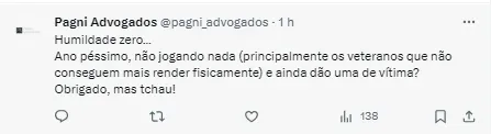 “Desde que começou o ano, sempre deixei bem claro que tenho contrato até dia 31 de dezembro. Por mais que o campeonato tenha acabado hoje, eu vou continuar cumprindo minha palavra. Depois, vou sentar com meu empresário para ver o que é melhor. Isso é o mais certo a se fazer em respeito ao clube.”