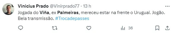 Confira as palavras do jornalista na live do UOL Esporte: “Está pra vir pro Flamengo. É verdade, estou falando sério, não é brincadeira. O Flamengo está se movimentando pra trazer. Para o Viña vir.”