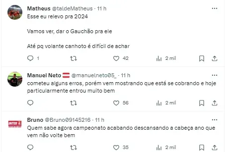 “Não caí de rendimento só por coisas fora do gramado. Perdi meu lugar como titular e todos os dias tento trabalhar para fazer meu melhor. Aceito todas críticas, mas não gosto quando é feita com maldade, quando falam sem saber. As vezes é melhor de repente chegar em mim.