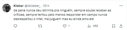 Porém, após o apito final e a vitória em seus domínios, um fator sobre um jogador do Internacional chamou a atenção na zona mista do estádio. De Peña desabafou sobre seu momento na equipe e fez duras críticas à imprensa.