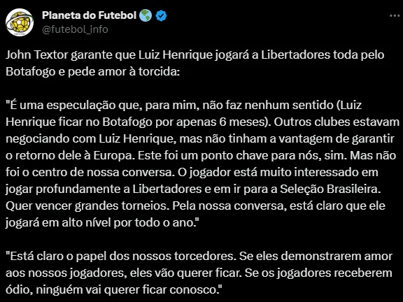 John Textor considera que a força do grupo atraí jogadores do quilate de Luiz Henrique e por isso esses jogadores deixam de escolher o Flamengo para aceitarem o plano de carreira da holding.